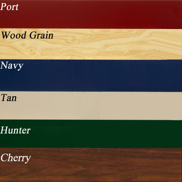 Laminate tops are available in Hunter, Port, Tan, Navy and Wood Grain.